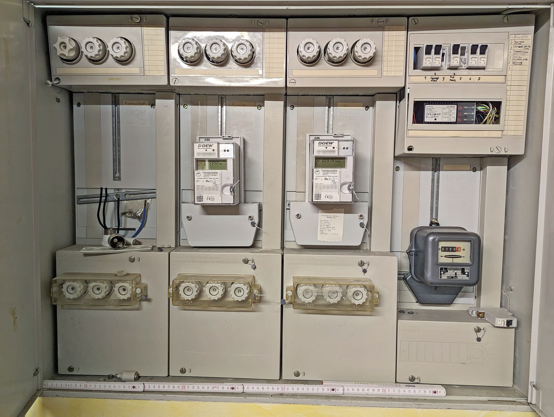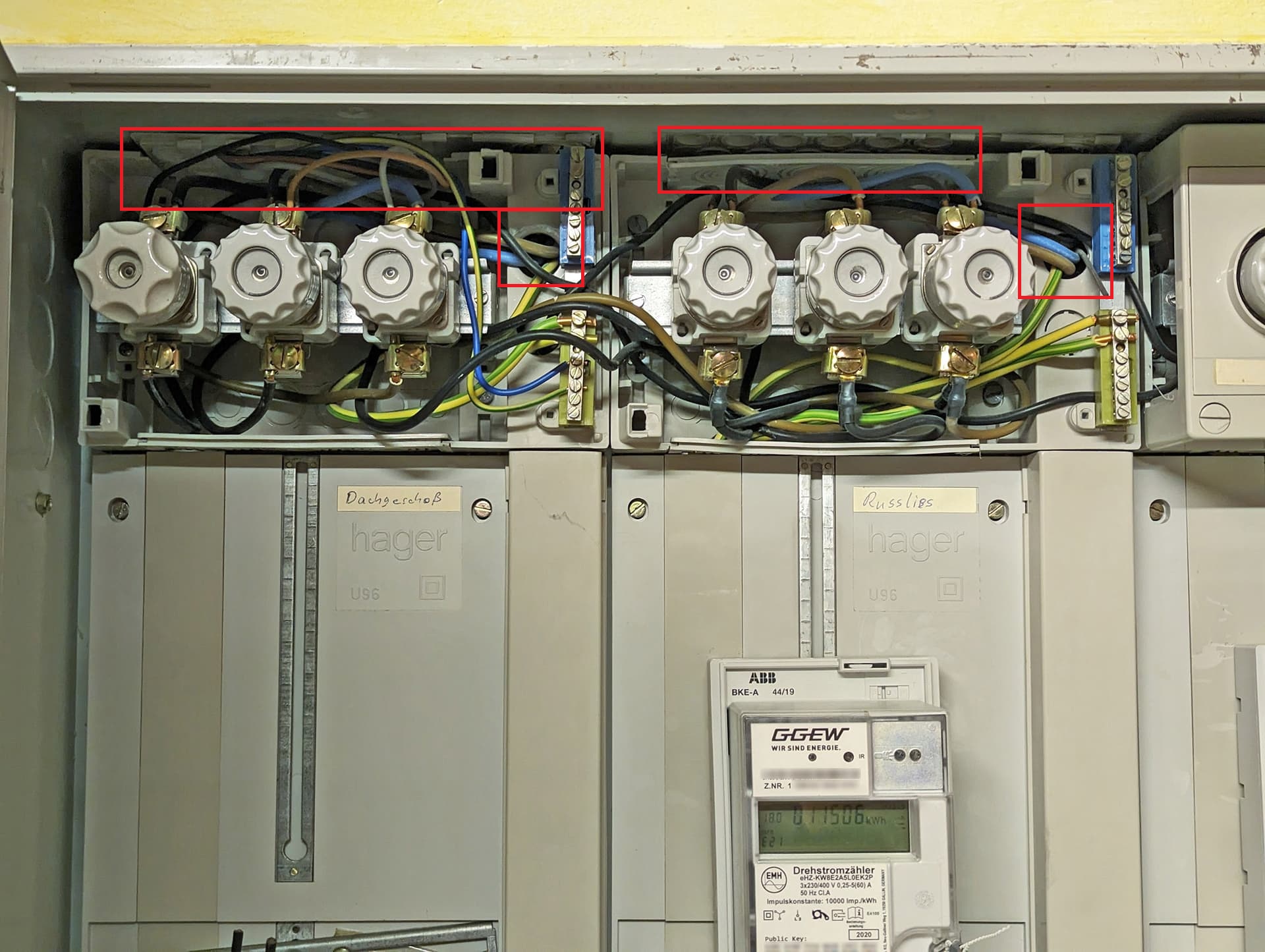 Danke Death, das dachte ich mir auch so ähnlich. Wo die Kabel genau aus dem ZS heraus verschwinden, kann man leider nicht so direkt sehen. Dazu müßte ich im oberen Zählerraum wohl diese Montageabdeckung öffnen, was aber schwierig ist bei der aktuellen Verkabelung. Vermutlich geht es rechts neben der UV heraus. Die Frage ist nur nach hinten oder oben.