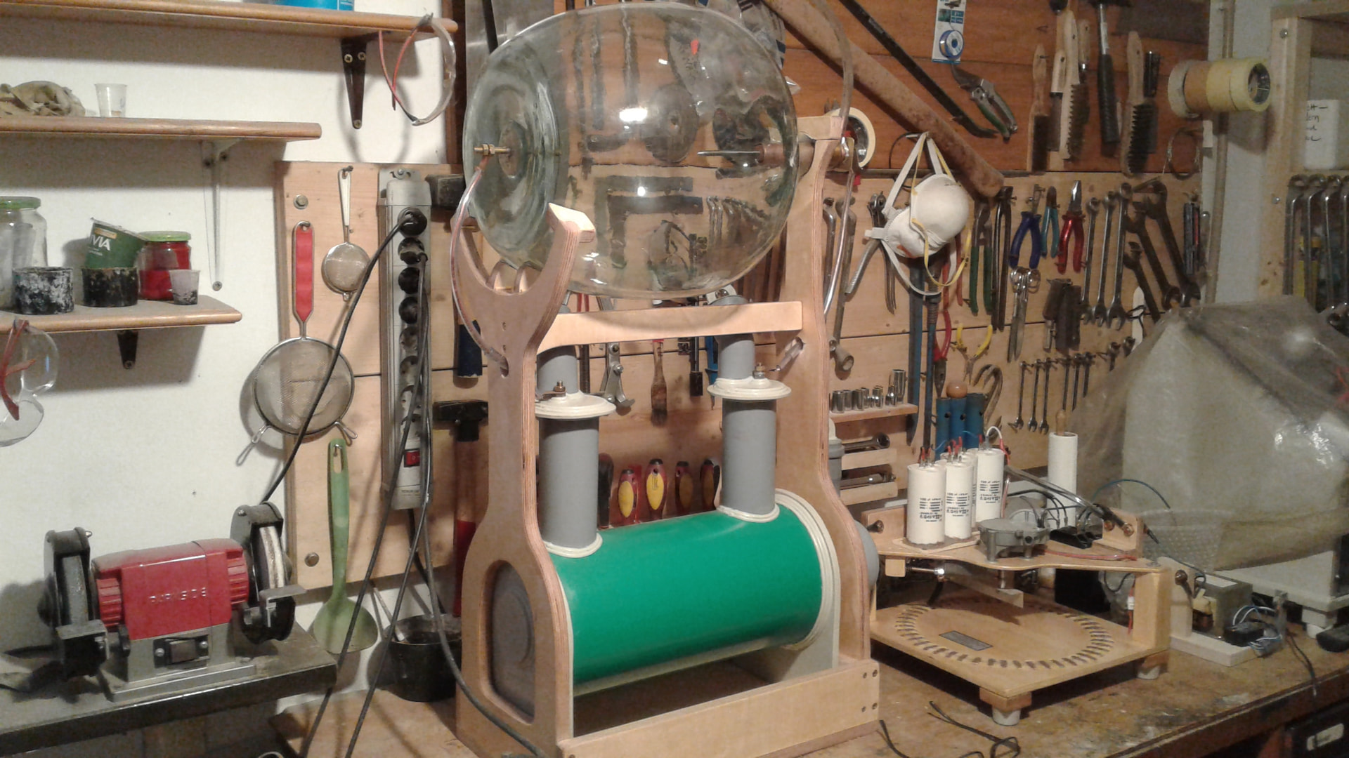 Habe hier mal mein neustes Projekt reingestellt. Einmal ohne Action und dann die Entladungen. es ist ein Weinballon, den ich zur Birne umgewandelt habe. Man könnte den mit verschiedenen Gasen füllen. Interessant ist, dass die Spannung auch unten über dem Isolatoren überschlägt, obwohl der Weg in der Birne kürzer ist.
