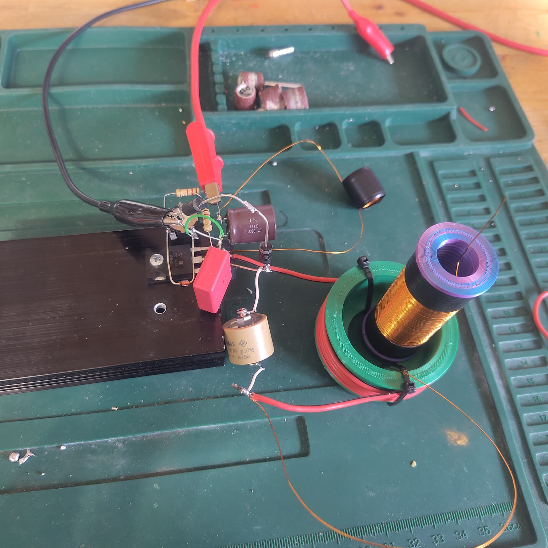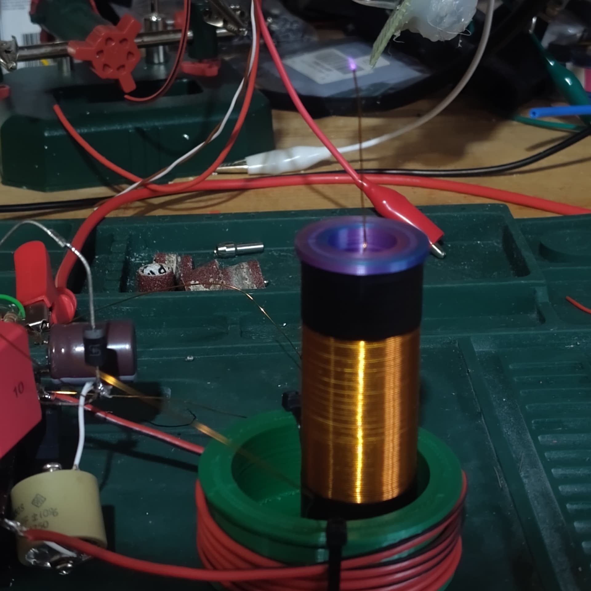 In der Zwischenzeit hab ich mal versucht herauszufinden was die Resonanzfrequenz meiner Sekundärspule ist. Dazu hab ich einen Slayer Exciter benutzt. Nur scheint das mit meiner Spule nicht zu klappen. Die Schaltung an sich funktioniert aber mit einer anderen größeren Sekundärspule. Kann das vielleicht an der Frequenz liegen? Das mein Transistor (TIP33C) bei 10MHz da nicht mitmacht? Das wäre jetzt meine einzige Erklärung. Ich hab auch die Primärspule mal umgepolt, das hat auch nichts gebracht.