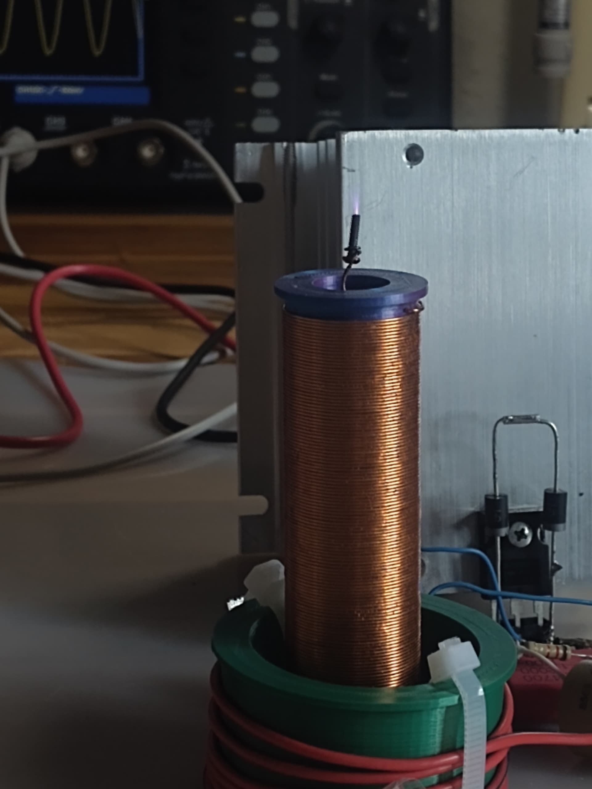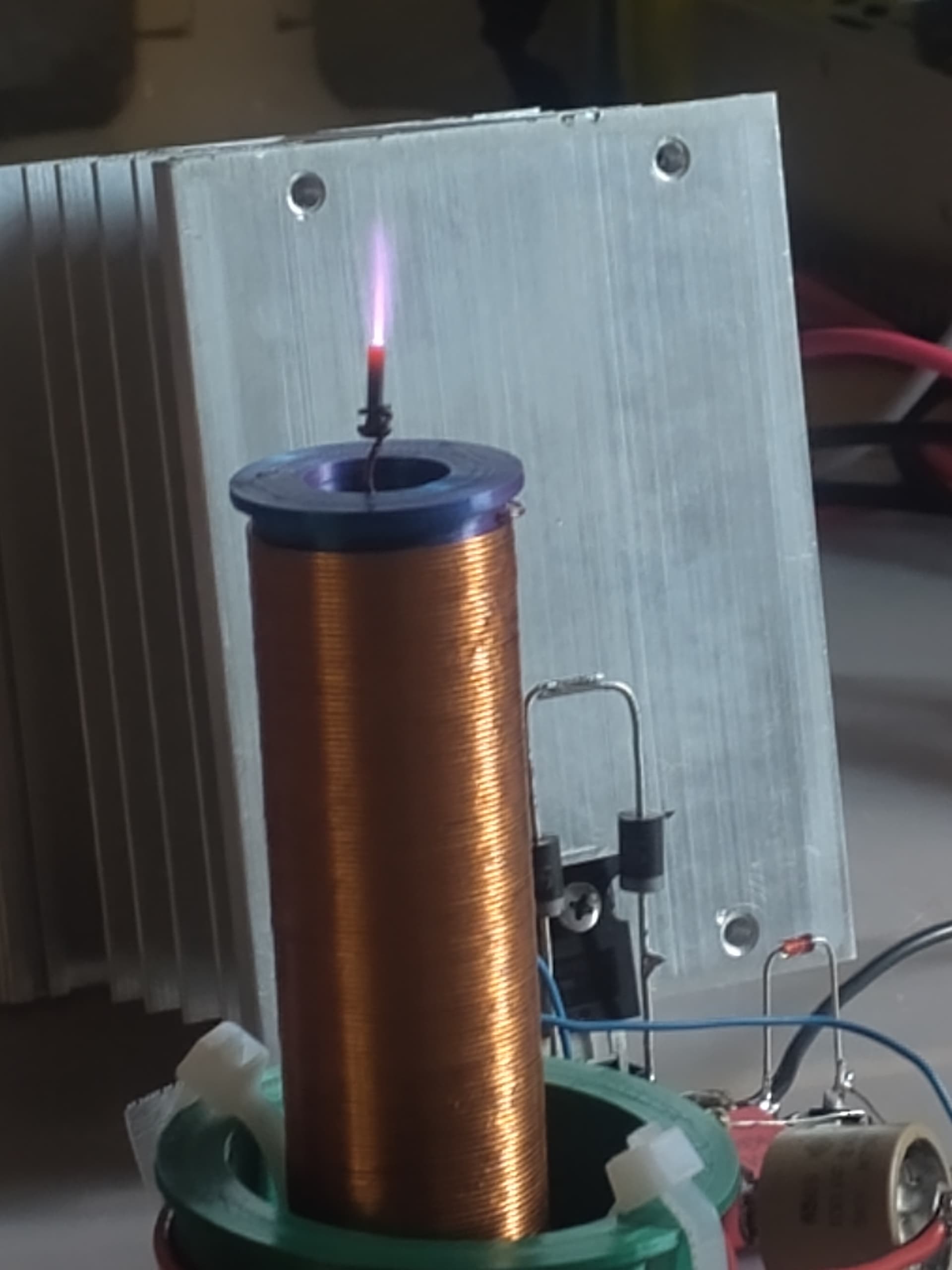 Bei 9,375Mhz und 17,5V bekomme ich so eine Plasmaflamme. Die sieht zwar nicht sehr imposant aus, aber ich freue mich trotzdem dass ich jetzt mal eine eigenständige Entladung habe.