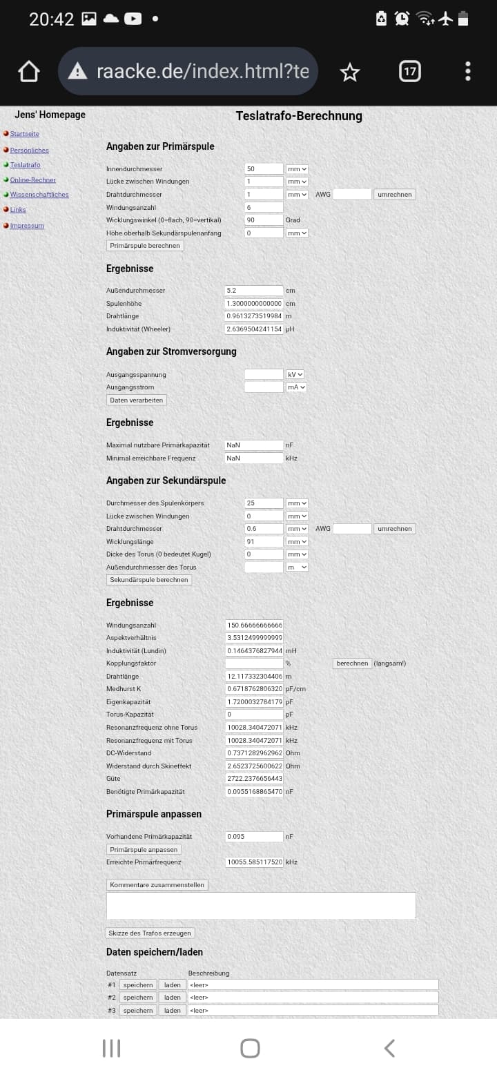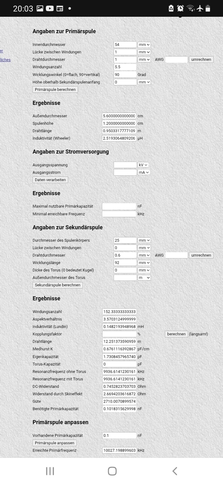 Da komme ich mit 152 Windungen auf etwas unter 10 Mhz, die Primärseite ist mit einem Innendurchmesser von 54mm bei ner Drahtstärke von 1mm + 2x 0,5 mm Isolierung angegeben. Der Cap ist mit 0,1 nf angegeben, wobei man hier auch die Toleranz berücksichtigen muß . Viele herzliche Grüße von axon-F.