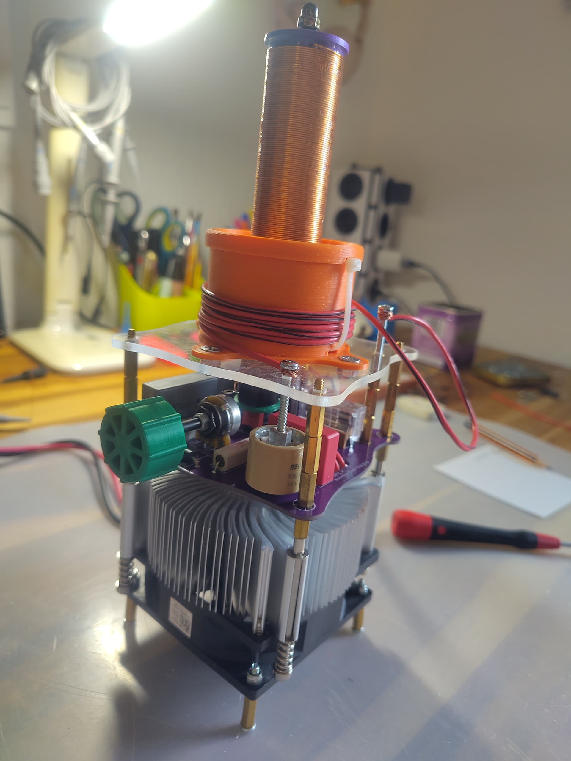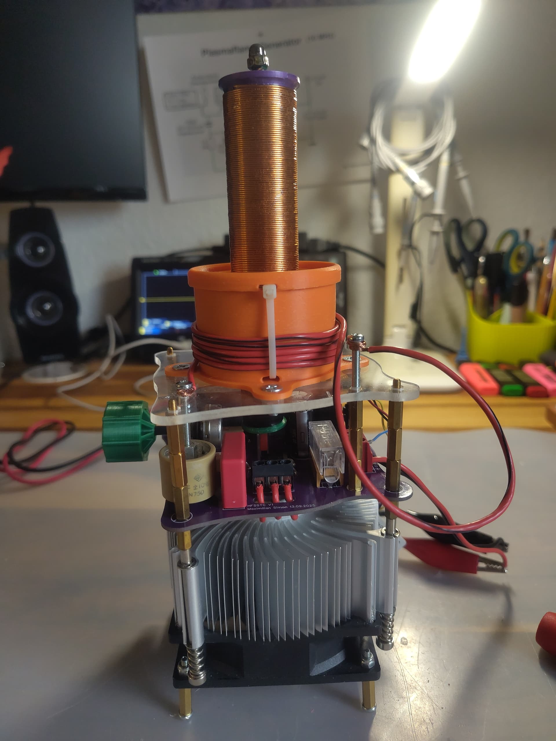 Ich hab jetzt eine Platine entwickelt, alles aufgelötet und einen großen Kühlkörper mit aktiver Kühlung installiert. Allerdings hat sich jetzt die Resonanzfrequenz verändert, bei meinen ursprünglichen 9,3MHz erscheint keine Plasmaflamme mehr.