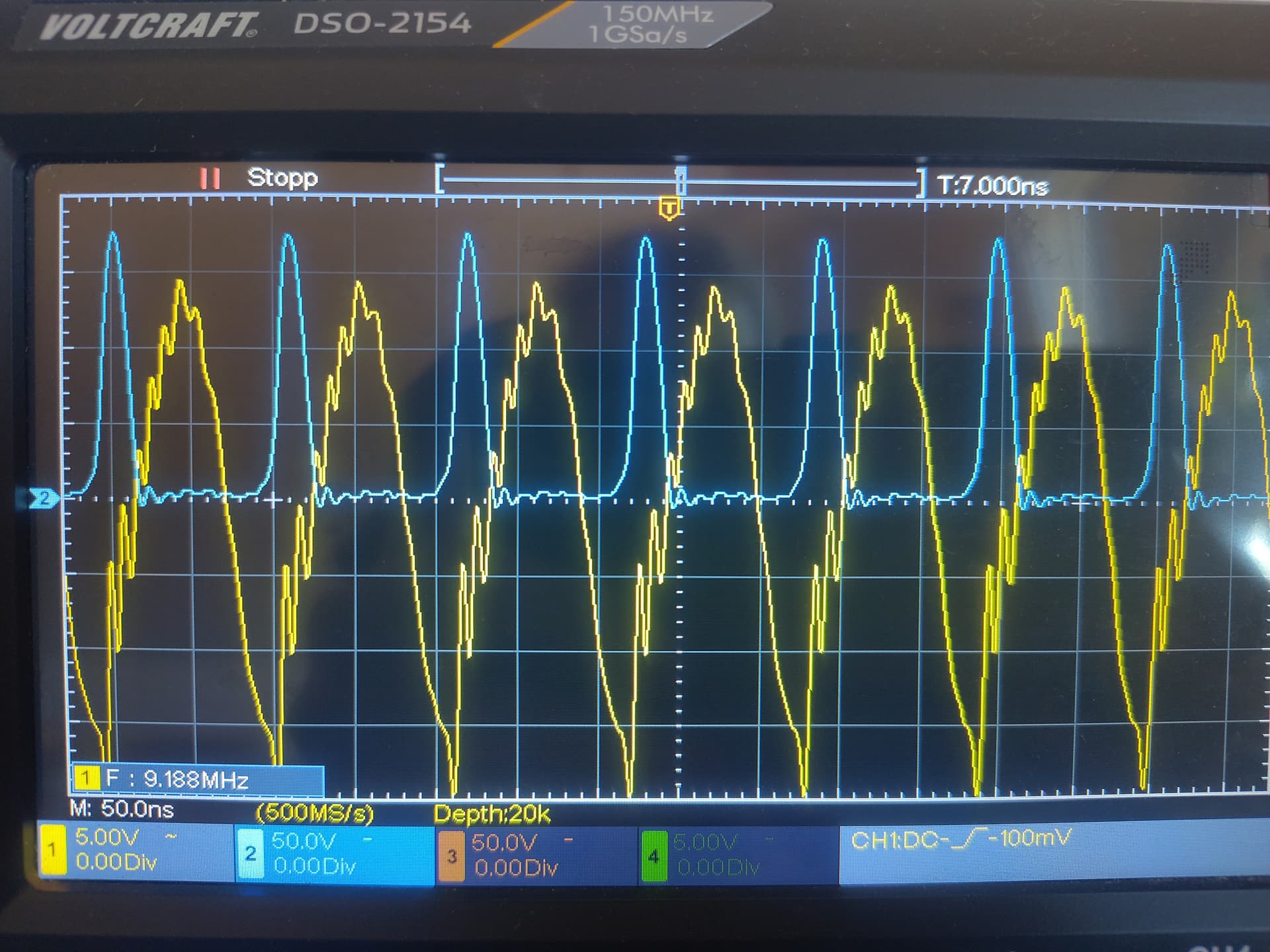 Dann ist mir aufgefallen dass die Gate Spannung komisch aussieht. Ist das normal? In dem PDF von Steve Ward sieht die Gate Spannung auch viel besser und sinusförmig aus.