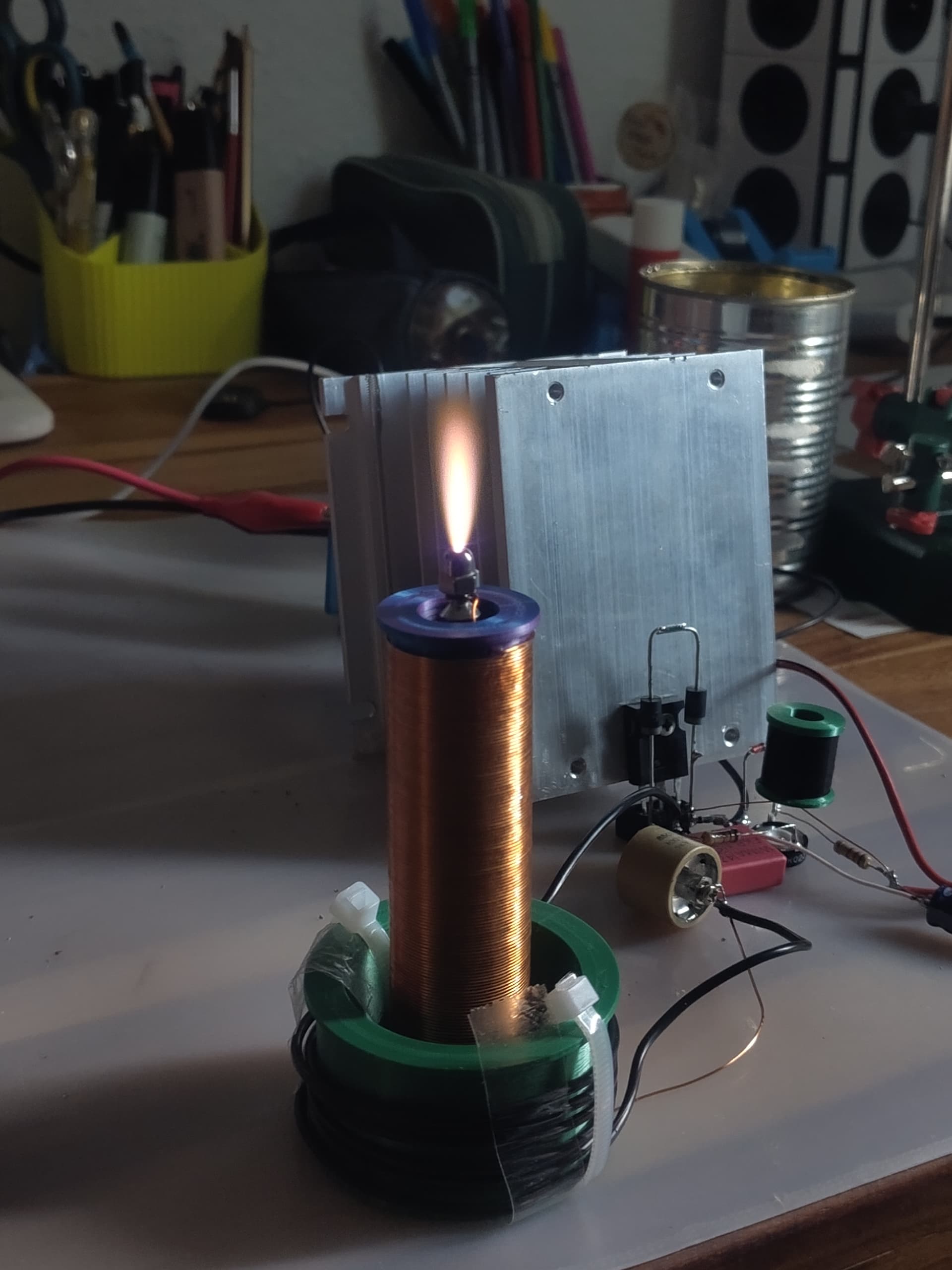 Ich hab nur irgendwie immer noch das Problem dass ich die Teslaspule nur kurz laufen lassen kann, weil der Mosfet wahnsinnig heiß wird. Viel länger als eine Minute traue ich mich nicht. Und der Strom steigt auch während dessen auf knapp 4A. Und wenn ich mit dem Poti runter Regel, geht mir die Flamme aus und die Schaltung schwingt nicht mehr. Wird das besser wenn ich die Induktivität weiter erhöhe? Irgendwie hab ich das Gefühl das bringt nicht sonderlich viel. Ich hab ja die Drossel schon von 4uH auf 10uH erhöht und viel verändert hat sich nicht.