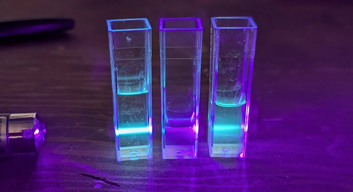 … OK - die Silizium-“Quantenpunkte” fluoreszieren etwas mehr im “blaugrünen” Bereich - also weg von Rot, mehr hin zu Blau verschoben - sollten sich die Farb-Verteilungen nach den Schichten mit der Ultrazentrifuge genauso zeigen, wie ich das erwarte, dürfte das schöne “Regenbogen” Effekte durch die Fraktionen zeigen