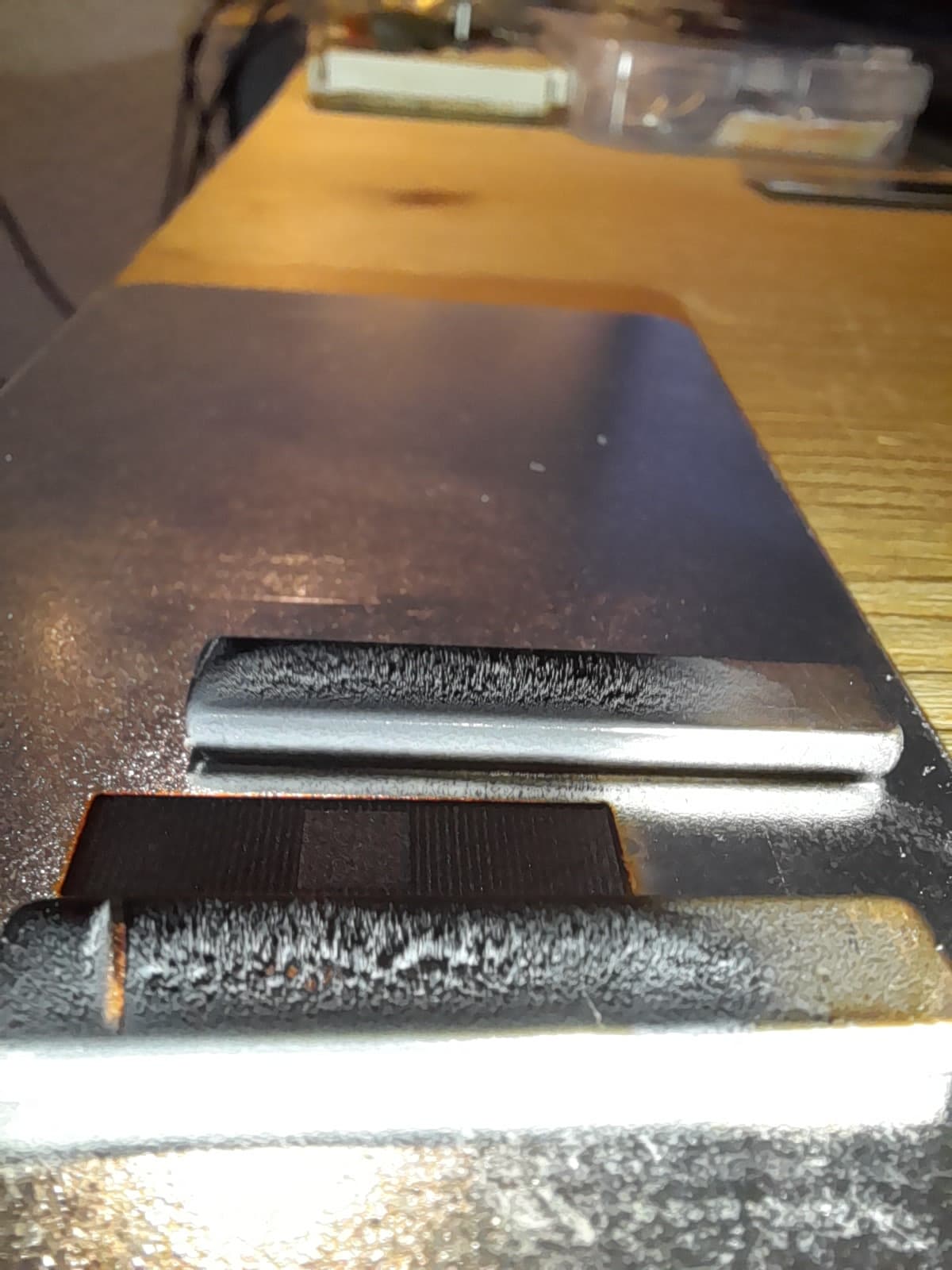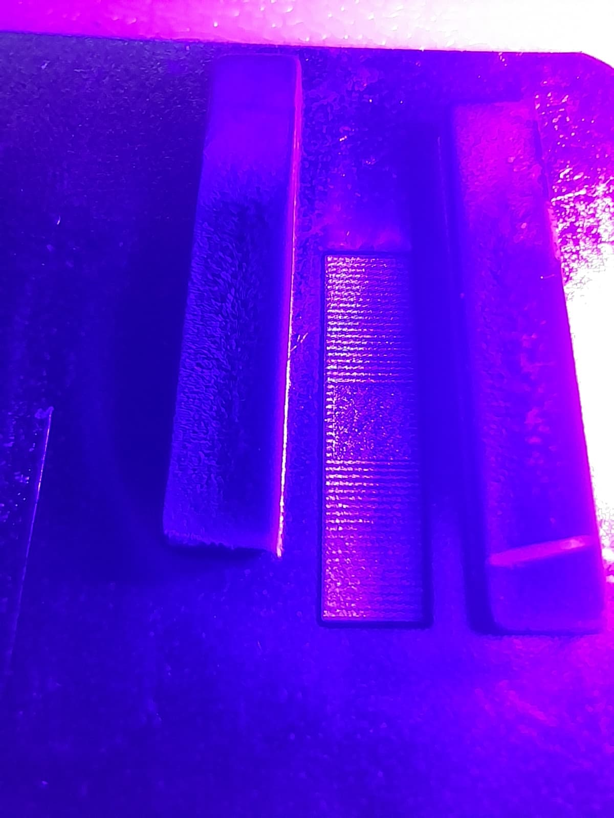 Die herausgearbeitete “Tasche” ist 20x5mm und 0.1mm tief – grob geschätzt um 60-80% von dem Material ist als “Magnetit” auf den Magneten sedimentiert … in 405nm (UV-LED) Licht sind noch keine Fluoreszenz-Quantenpunkte zu sehen oder durch die LED überstrahlt: