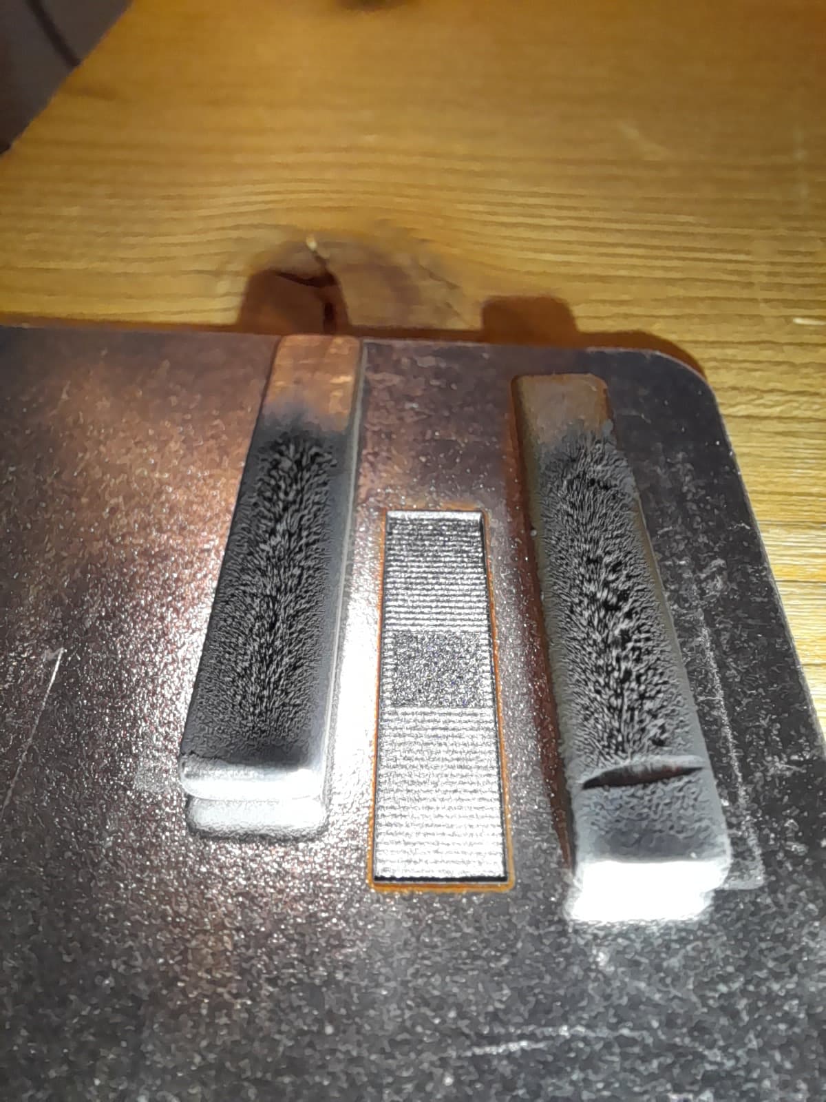 … aktuell läuft ein Versuch mit dem gleichen Material in Sonnenblumenöl – hab’ das in einem kleinen Glas mit etwa 3-4mm Öl darüber - bei 40%Laser-Leistung sehe ich in der Schraffier-Spur “blauweißes” Plasma und dunkelgraue “Schwaden” mit ab und an einem Bläschen aufsteigen … der etwa 20mm außen, neben dem Glas aufgestellten Magnet hat schon einiges an schwarzem Material aufgefangen - noch viel mehr ist “unsichtbar” in dem Öl gelöst - das wird dann mit der Zeit auch zum Magneten wandern bzw. ich werde das mit ein paar weiteren Magneten zusammesuchen und kombinieren … dann gibts auch ein paar Bilder davon …