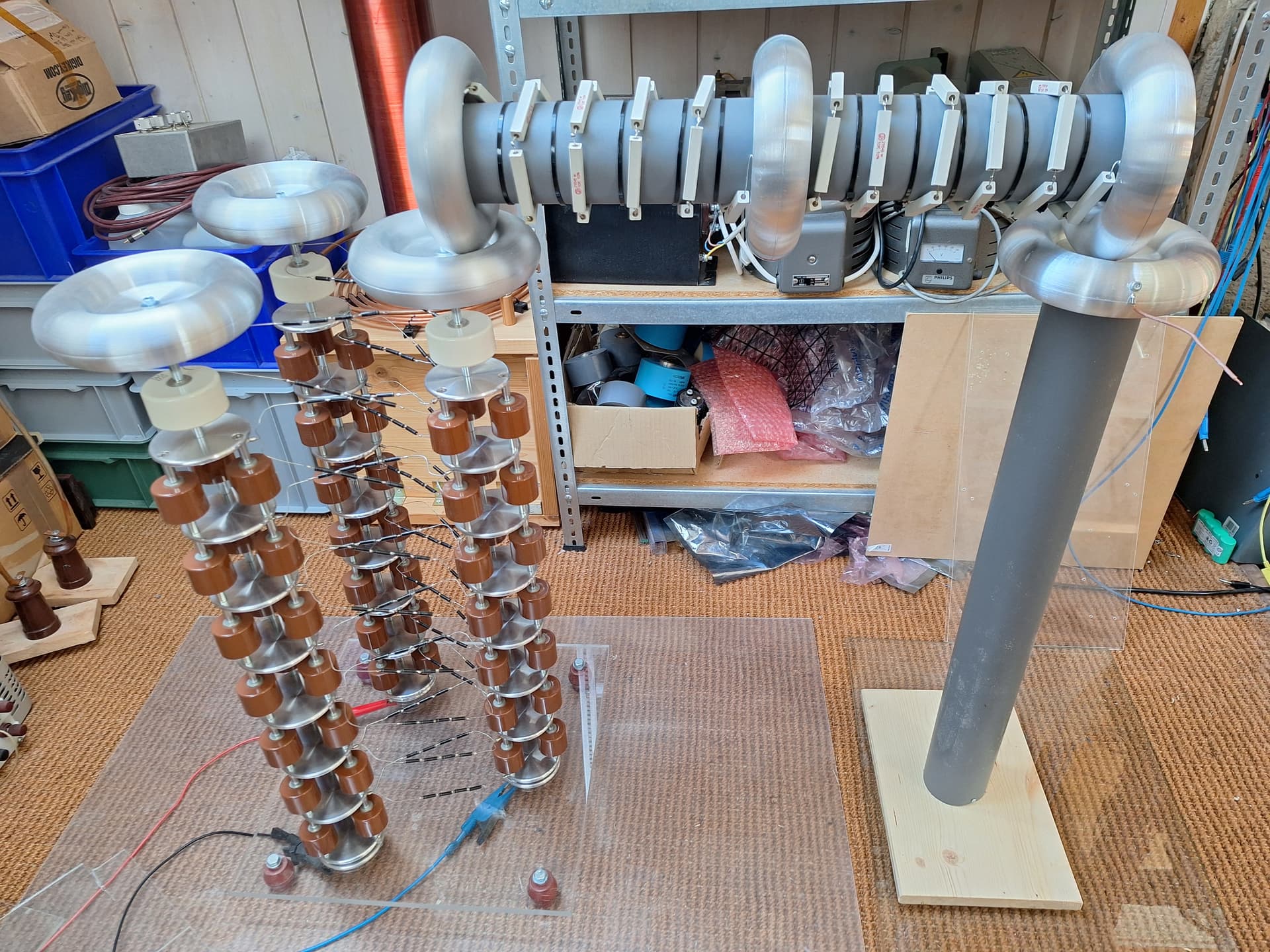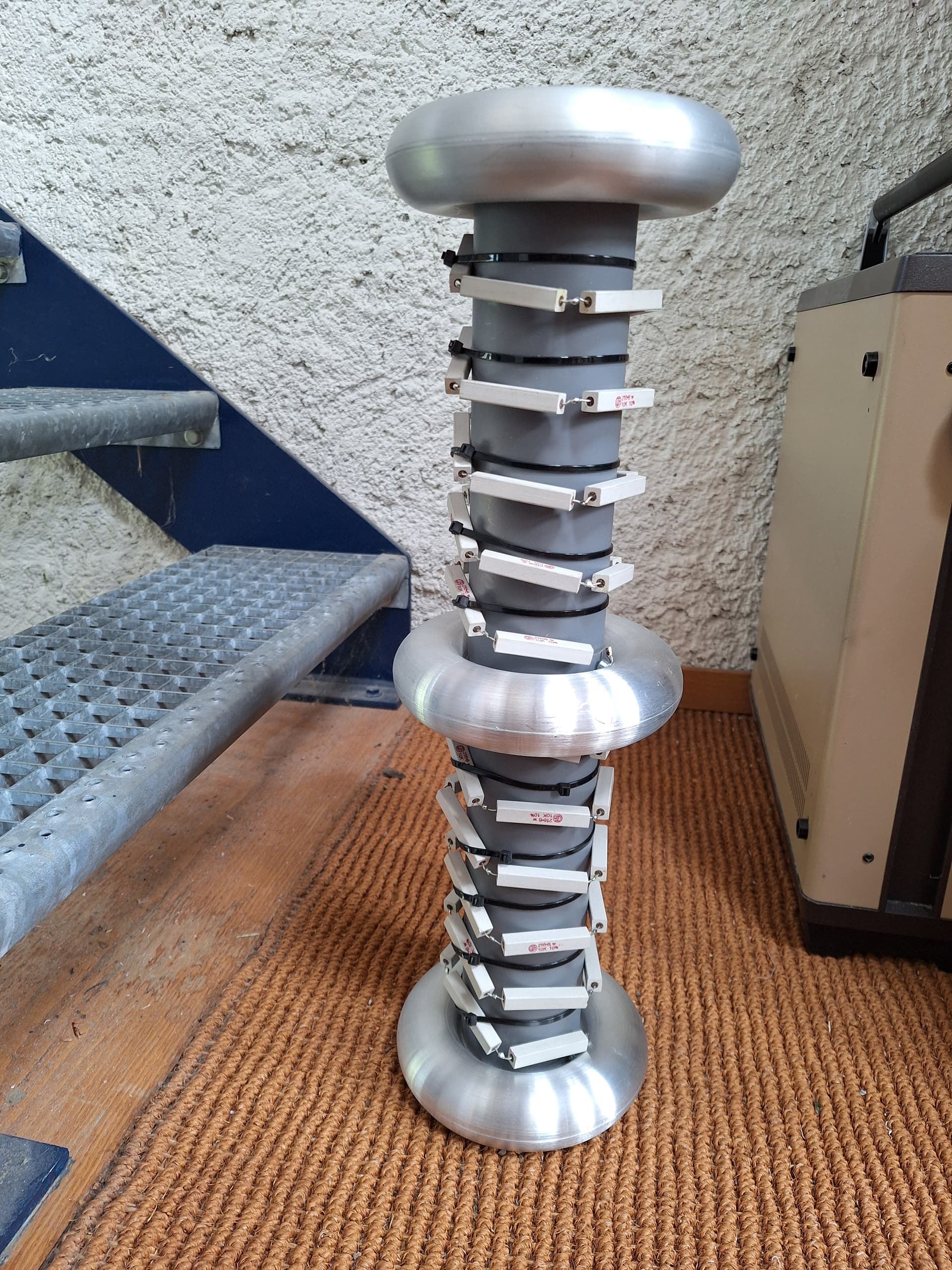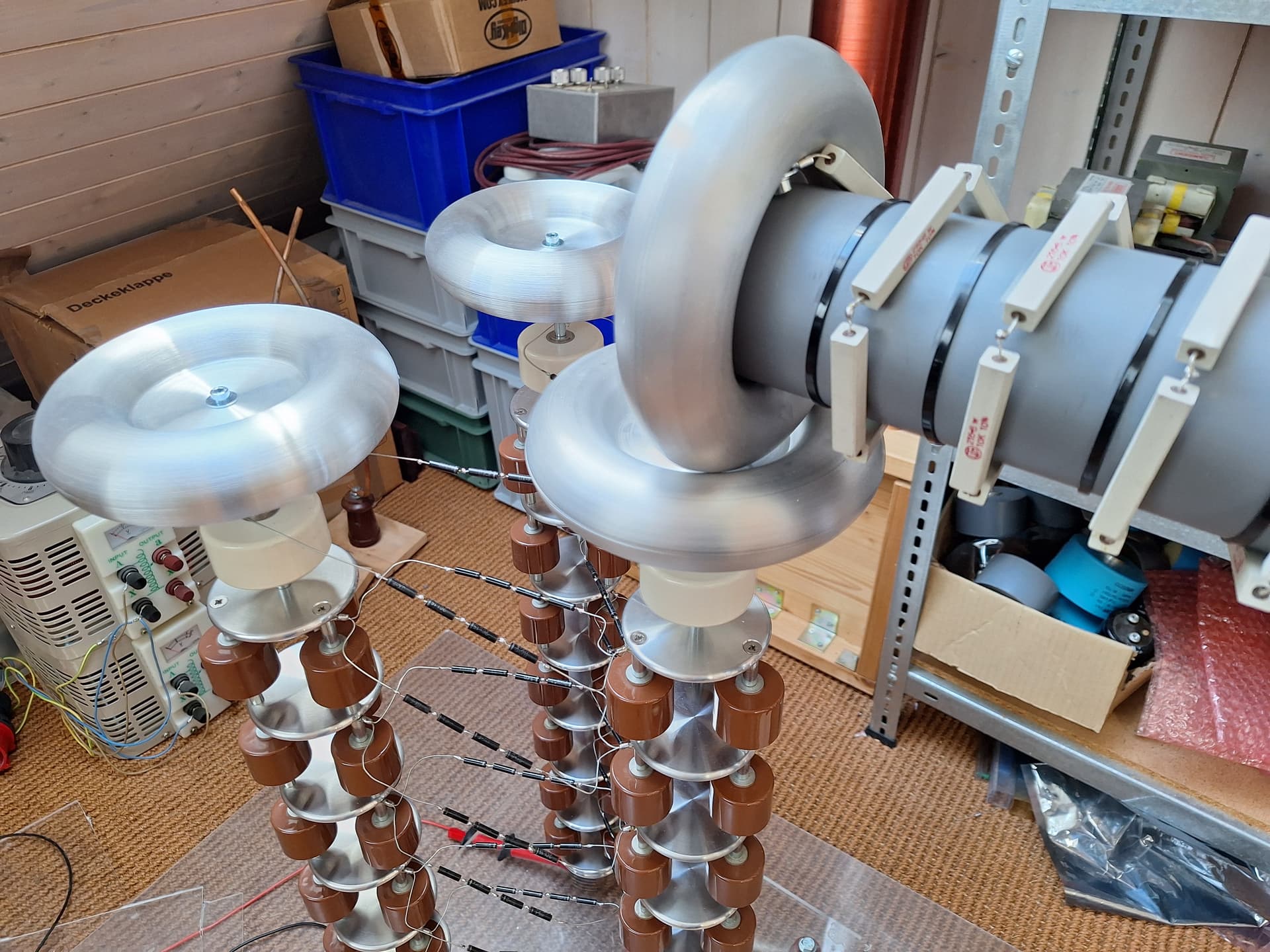 Es gibt bei diesem Projekt einige Neuigkeiten. Inzwischen habe ich die Kaskaden wieder auf das ursprüngliche Vollwellendesign umgebaut, da die Leistung dann ungleich höher ist. Der Umbau war sehr aufwendig. Ich musste die beiden Halbwellenkaskaden vollständig abbauen und die Vollwellentürme erneut aufbauen, somit kann man eigentlich gar nicht mehr von einem Umbau als vielmehr von einem Neubau sprechen. Das Vollwellendesign benötigt mehr Toroide, von denen ich nicht unbegrenzt viele habe, deshalb sind weniger Stufen möglich. Um die Ausgangsspannung dennoch etwas zu erhöhen, habe ich jedem Turm noch eine weitere Stufe verpasst und zuoberst mit grossen Toploads vom highvoltageshop abgeschlossen. Es sind somit nun acht Stufen pro Turm. Dies ergibt ein theoretisch maximale Differenzspannung von 800kV zwischen den Türmen.