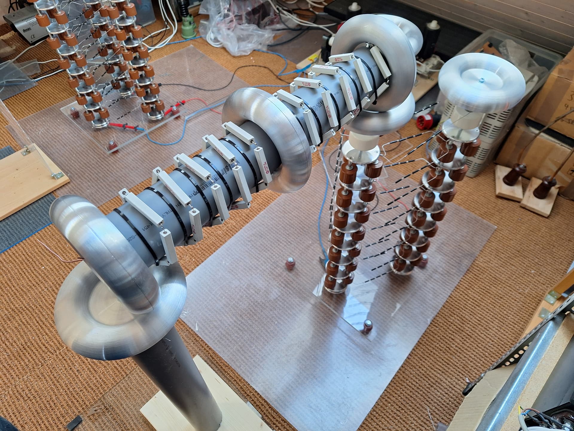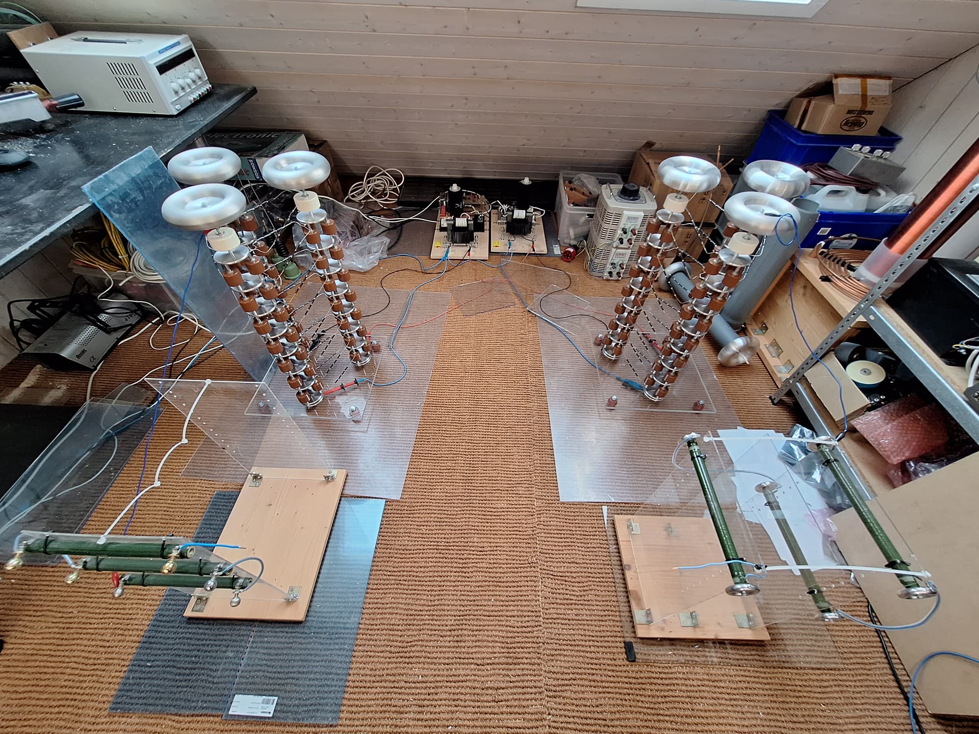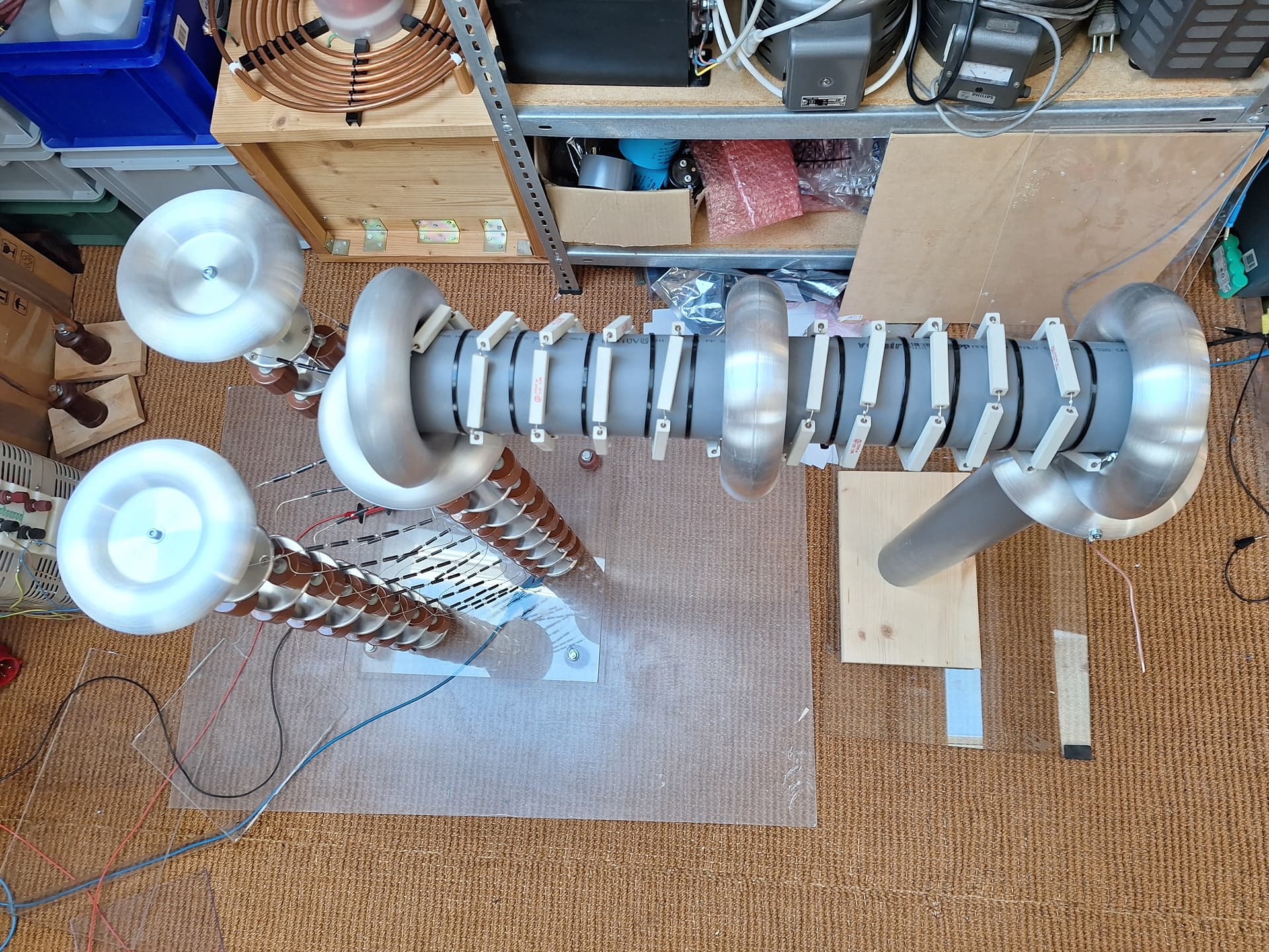 Es gibt bei diesem Projekt einige Neuigkeiten. Inzwischen habe ich die Kaskaden wieder auf das ursprüngliche Vollwellendesign umgebaut, da die Leistung dann ungleich höher ist. Der Umbau war sehr aufwendig. Ich musste die beiden Halbwellenkaskaden vollständig abbauen und die Vollwellentürme erneut aufbauen, somit kann man eigentlich gar nicht mehr von einem Umbau als vielmehr von einem Neubau sprechen. Das Vollwellendesign benötigt mehr Toroide, von denen ich nicht unbegrenzt viele habe, deshalb sind weniger Stufen möglich. Um die Ausgangsspannung dennoch etwas zu erhöhen, habe ich jedem Turm noch eine weitere Stufe verpasst und zuoberst mit grossen Toploads vom highvoltageshop abgeschlossen. Es sind somit nun acht Stufen pro Turm. Dies ergibt ein theoretisch maximale Differenzspannung von 800kV zwischen den Türmen.