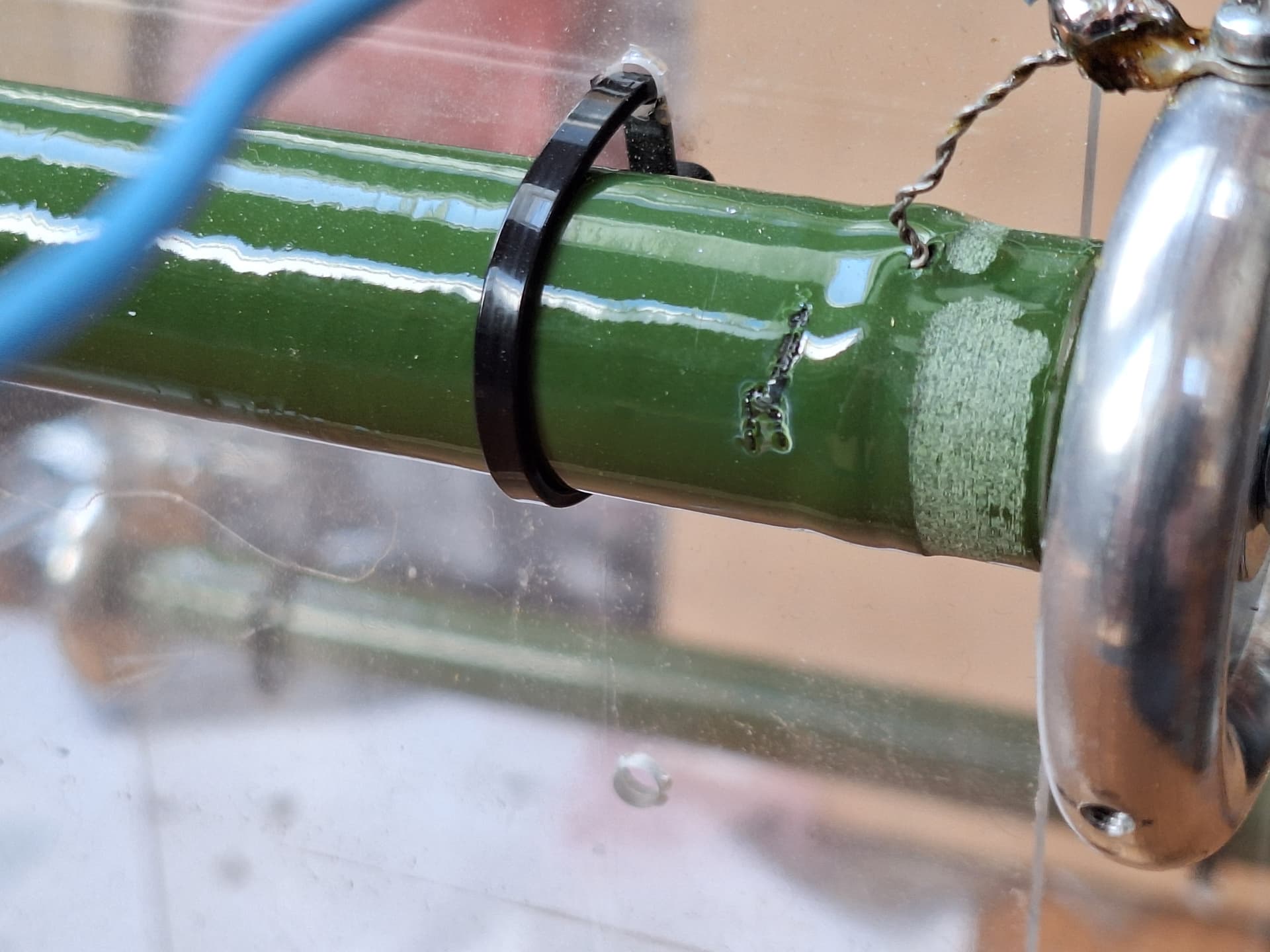 Habe sie dann mit den anderen drei Rosenthalwiderständen, welche ich schon im Setup hatte, kombiniert. Leider hat es jedoch aufgrund des hohen Stromes einen der Widerstände verheizt. Das Setup zieht inzwischen knapp 10kW Leistung vom Netz. Bei 165V des Variacs hatte ich einen Strom von 58A gemessen. Höher als 165V konnte ich nicht gehen, da es sonst an diversen Stellen zu Überschlägen auf umliegende Gegenstände kam. Ausserdem wird die hohe Leistungsaufnahme der Schaltung mehr und mehr ein Problem für den Variac. Der Variac wäre eigentlich nur für 28A dauerhaft gedacht. Der Lichtbogen ist inzwischen so hell, dass man ihn sogar bei Sonnenschein noch gut sieht. Hier ein Bild: