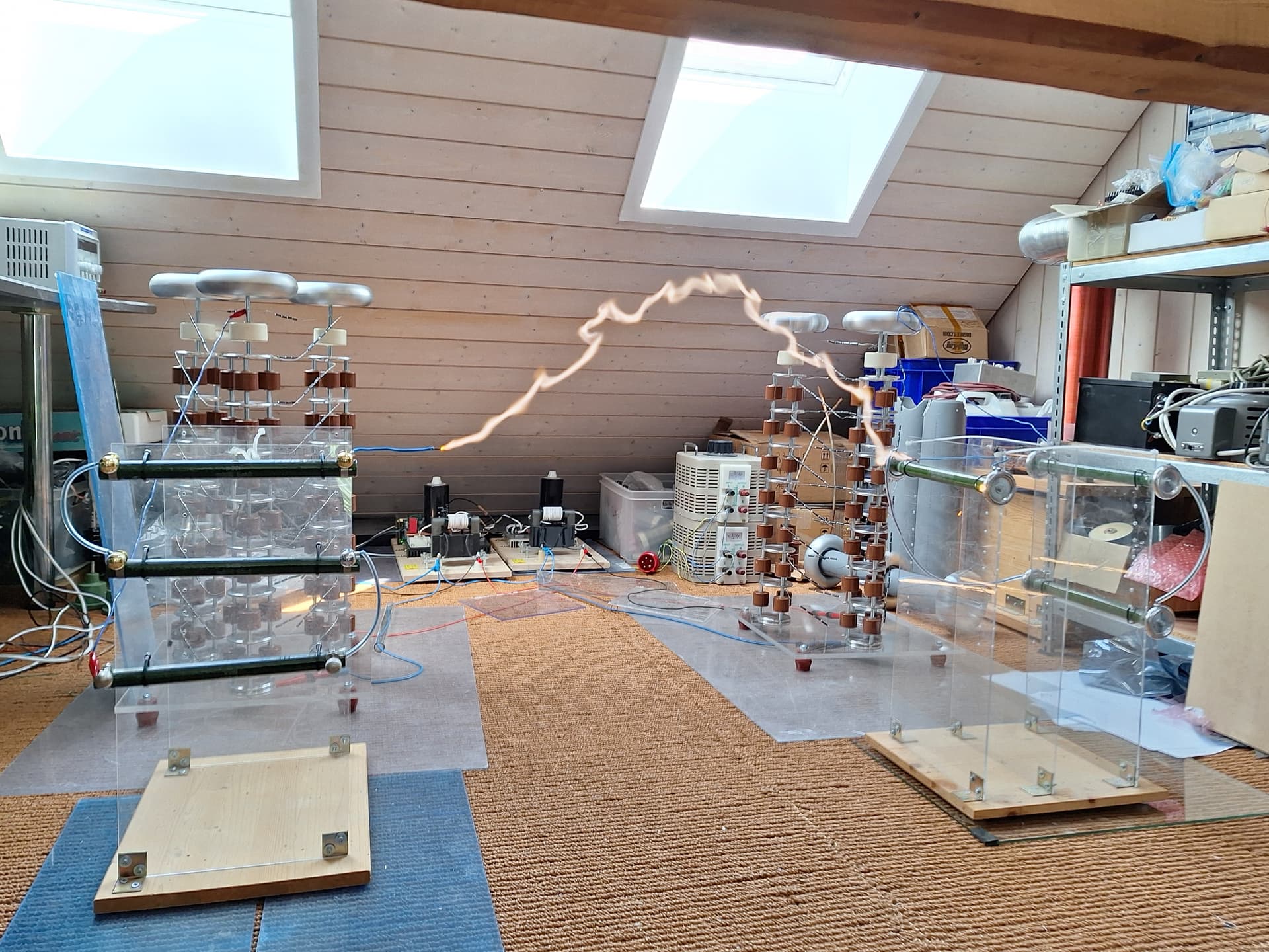 Die Kaskaden könnten definitiv mehr. Leider habe ich hier aber diverse Begrenzungen, allem voran die Platzverhältnisse, aber auch die Schwierigkeiten bei den Widerstandsketten und die etwas knappe Leistung des Variacs (und nein, ein Betrieb ohne Variac wäre dumm). Vielleicht versuche ich dann auch mal, beiden Kaskaden einige Stufen zu entfernen für weniger Spannung, dafür aber mit sehr hohem Strom. Wäre sicher auch reizvoll.