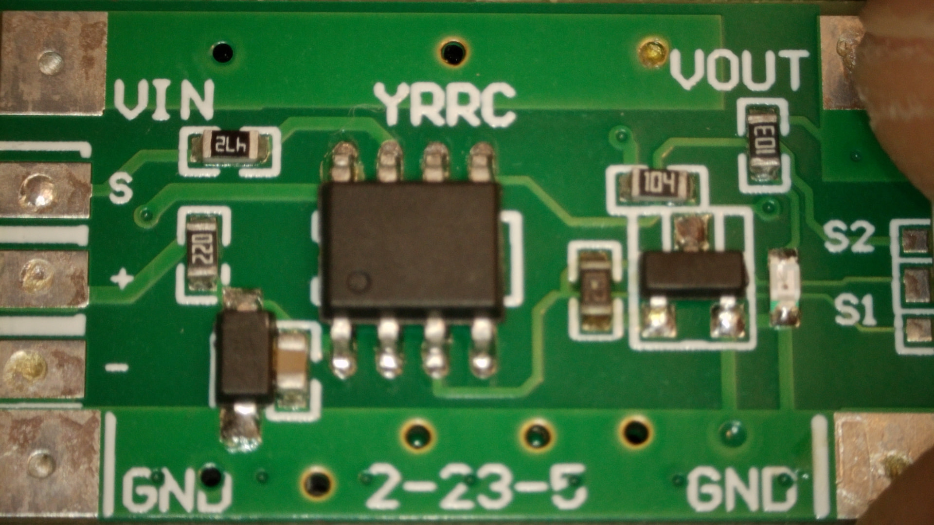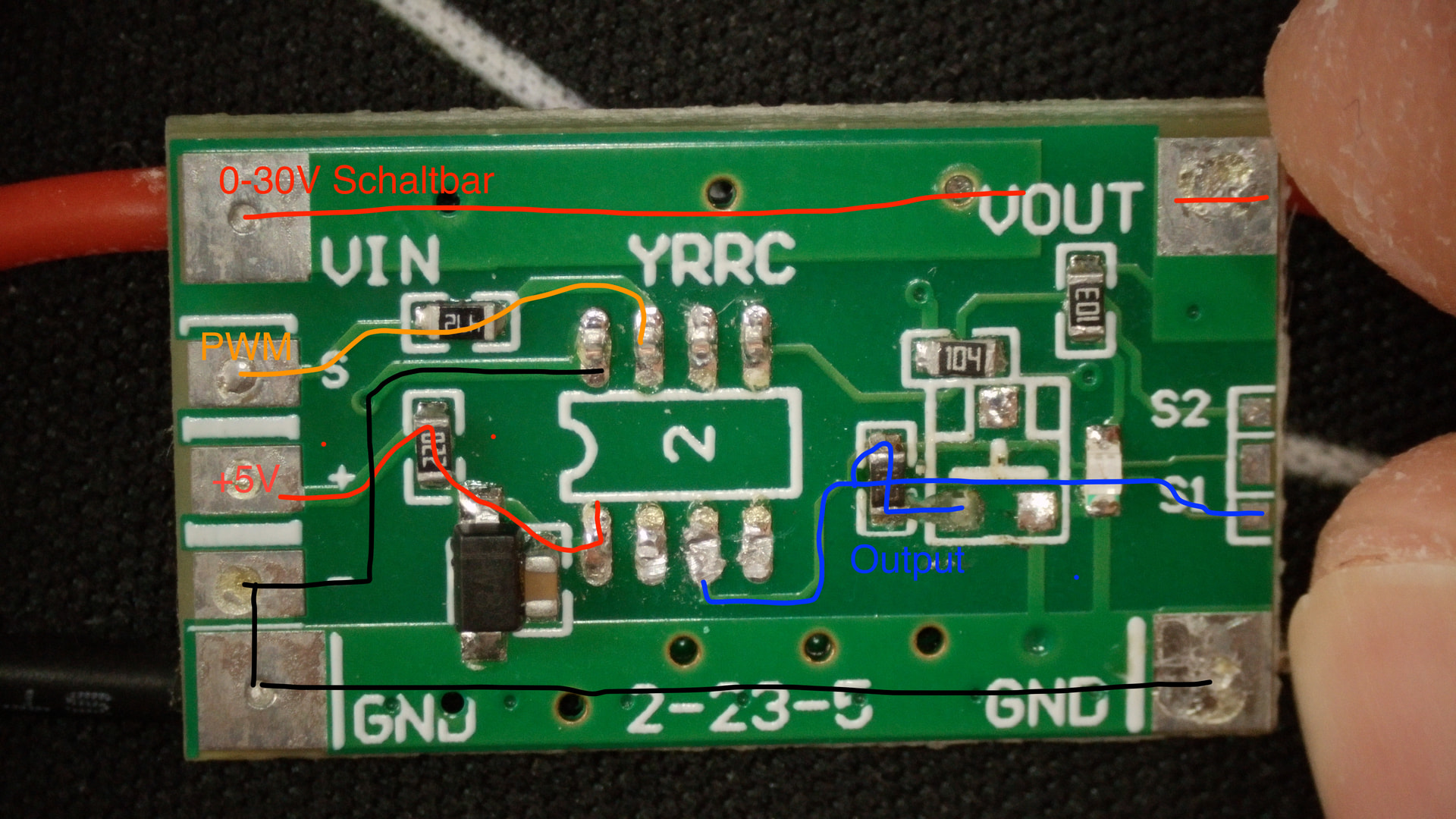 Genau, es ist eine Platine aus dem RC Modellbau um PWM Signale in On/Off Signale zu verwandeln um eine Leistung zu schalten. Heißt: Ab einem gewissen Schwellwert des PWM Signals schaltet die Platine die 0-30V von der Eingangsseite auf die Ausgangsseite. S, + und - kommen vom RC Empfänger und bringen die 5V.