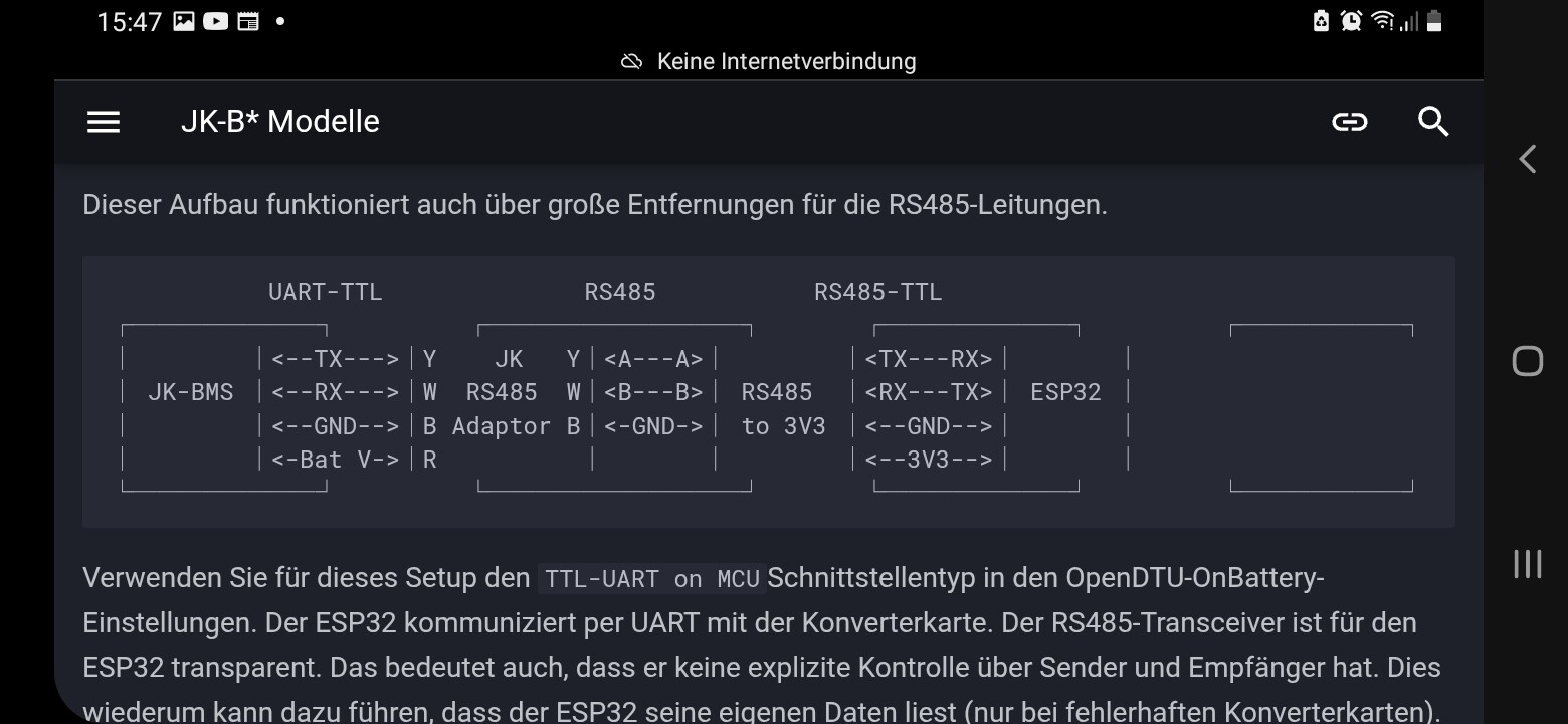Hallo und einen schönen Sonntagabend, ich wollte heute mal das JK BMS über das Orginale RS 485 Adapter über eine RS 485 zu UART Karte mit der Open Dtu on Battery verbinden. Am ESP 32 sind RX und TX, 3,3V und GND richtig angeschlossen.