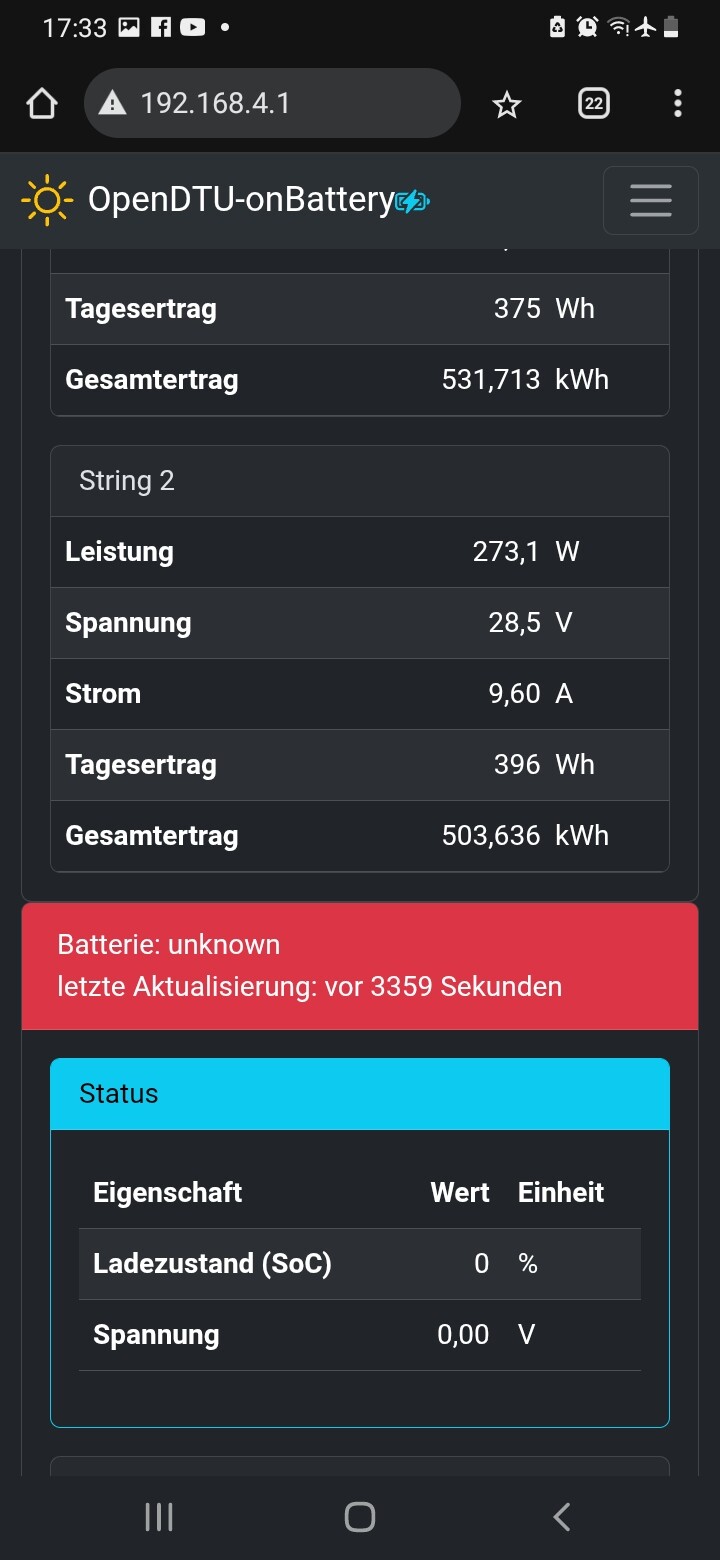 Hallo und einen schönen Donnerstagnachmittag, hallo Multi KV, ein herzliches Dankeschön noch für deinen Beitrag. Wie schon erwähnt, ich arbeite mich gerade erst in dieses Thema ein. Im Netz gibt’s ja auch die unterschiedlichsten Meinungen, wie oft und wie lange ein Lifepo auf 100 % sein sollte, das Balancing muss eben auch gewährleistet sein. Ich würde erst mal den HM 800 vom Dach holen, und diesen am Lastausgang anschließen, über die Open DTU on Battery kann ich danach die Leistung des WR steuern, und sehen was noch fürs Laden übrig bleibt. Viele herzliche Grüße von axon-F.