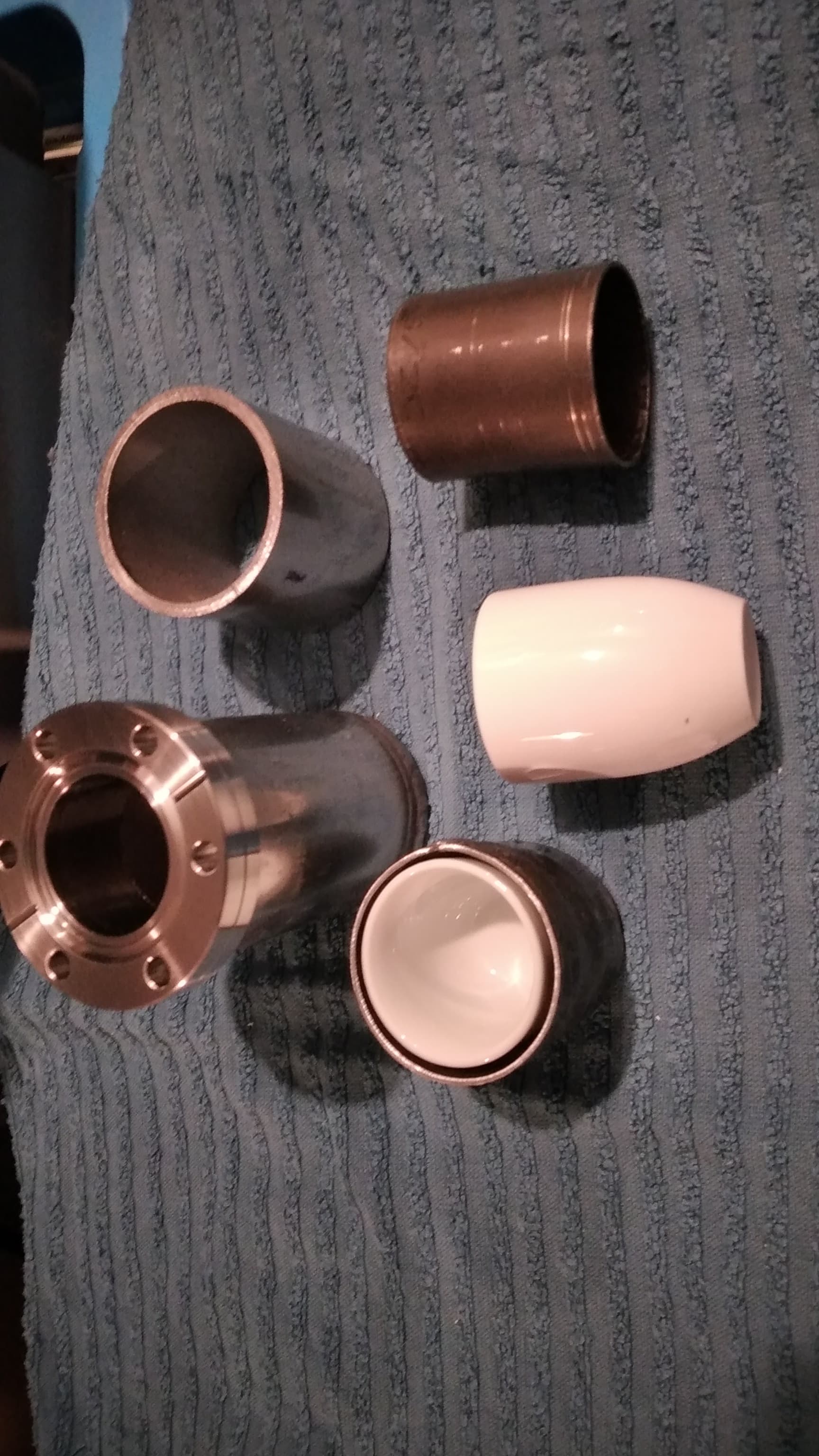 . Im Anschluss poste ich noch einige Bildchen vom Espresso- Porzellan- Tiegel mit dem Heizzylinder aus Alloy 620. Ich hatte erst versucht, den geschweißten Zylinder etwas aufzuweiten, da müßte man sich erst mal ein passendes Gesenk drehen. Auf ner Drück - Bank könnte man sich auch was passendes herstellen…