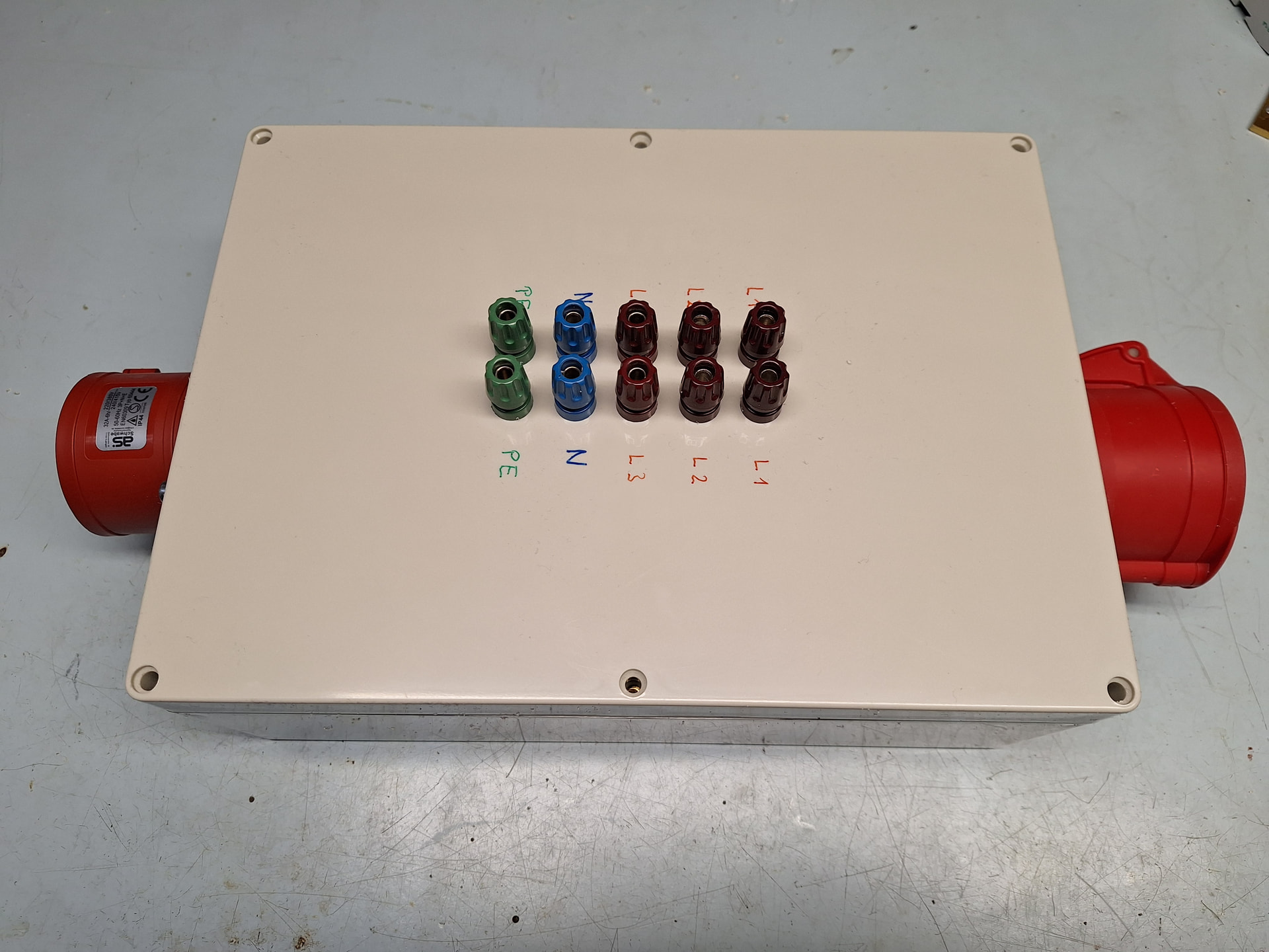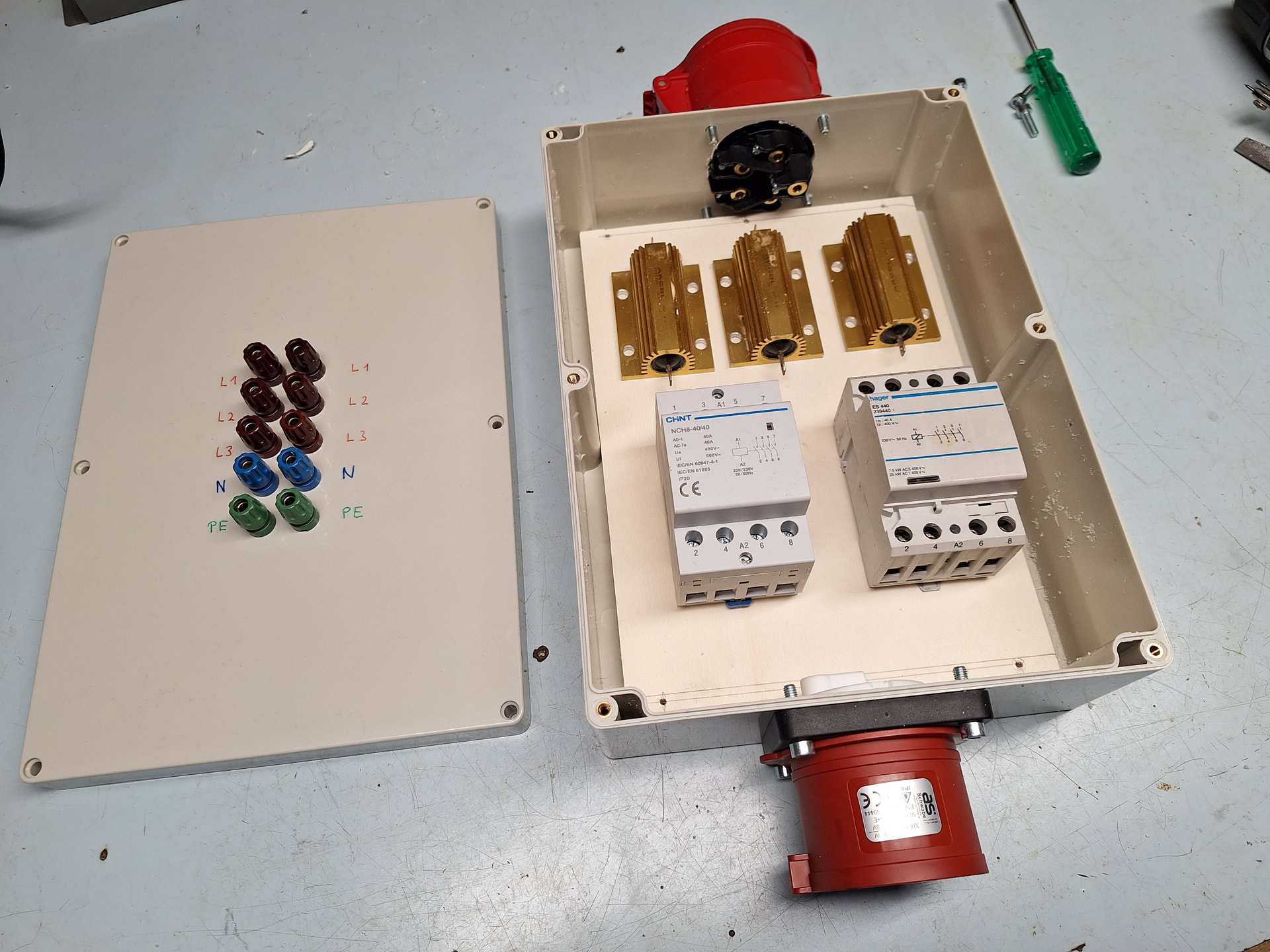 Aktuell bin ich an einem kleinen Zwischenprojekt, welches später ebenfalls dem Kaskadensetup dienen soll. Ich baue gerade eine simple, praktische und kleine Dreiphasenverteilbox, welche den Einschaltstrom für jede der drei Phasen begrenzen soll und gleichzeitig auch verschiedene Anschlussmöglichkeiten bieten soll. Die Idee ist, dass mit einem Ein-/Aus-Schalter ein dreiphasiger 40A-Schütz aktiviert werden soll, welcher die drei Phasen vom Eingang an drei 33-Ohm-Leistungswiderstände liefern soll, welche dann einige ms später von einem zweiten Dreiphasenschütz überbrückt werden. Als Ausgang habe ich einerseits einen CEE32-Anschluss vorgesehen, andererseits aber auch jeweils zwei parallel geschaltene 4mm Laborbuchsen für jede Phase, den Neutralleiter und den Schutzleiter. So kann ich auch mit einfachen Laborkabeln die geschalteten und strombegrenzten 400V abgreifen. Natürlich lässt sich so auch problemlos einphasig oder zweiphasig abgreifen, je nach Bedarf.