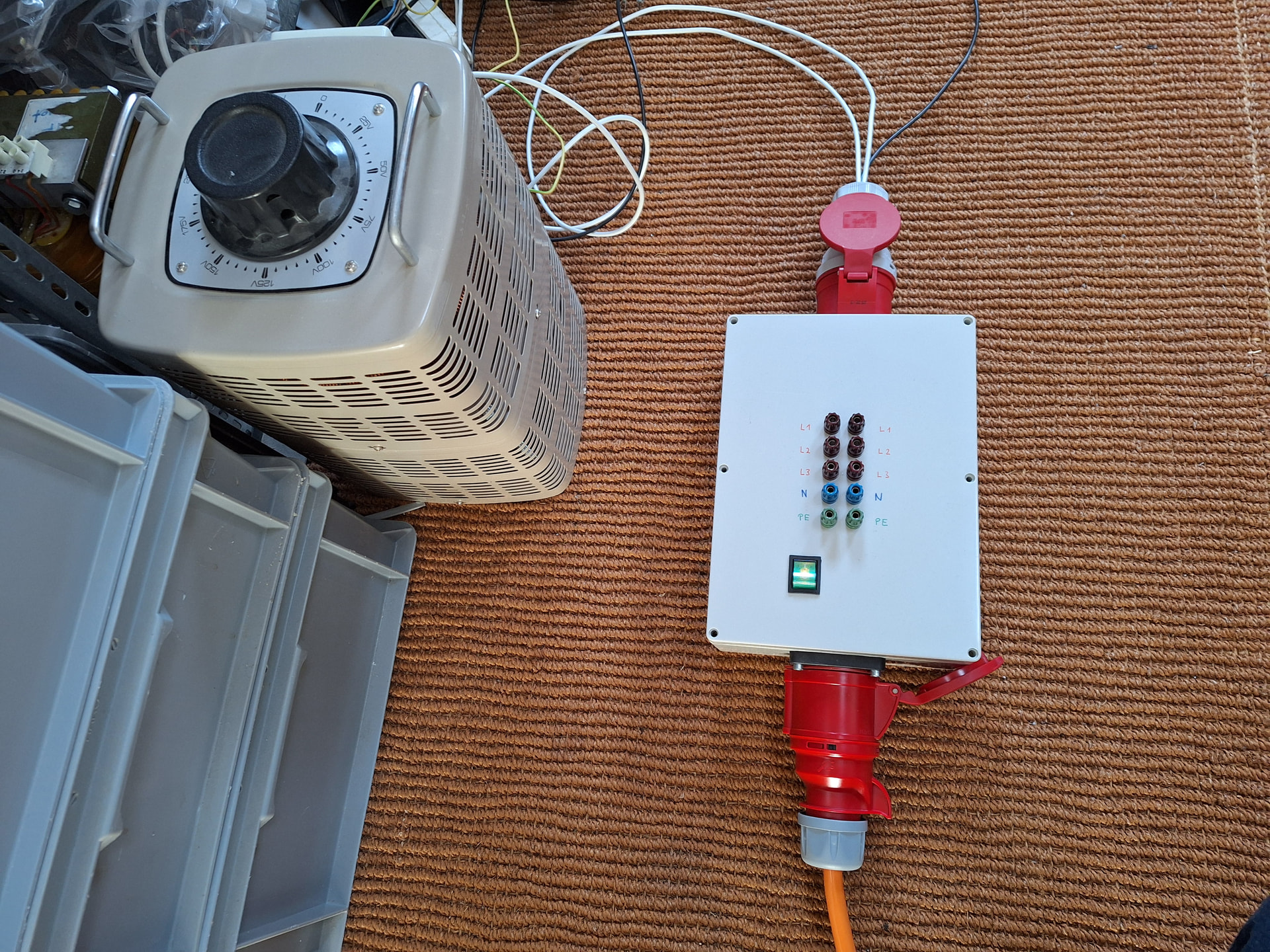 Inzwischen habe ich die Dreiphasenbox mal soweit fertiggestellt, dass die CEE32-Anschlüsse betriebsbereit sind. Die 4mm-Laboranschlüsse habe ich noch nicht verdrahtet, dies werde ich später noch nachholen. Das Ganze ist, wenn man das so sagen darf, eine echte Strafarbeit. Ich hätte nie gedacht, dass die Verdrahtung mit dem 4mm2-Draht derart mühsam werden würde, und ja, einen Schönheitswettbewerb lässt sich mit dieser Box auch nicht gewinnen, aber immerhin funktioniert sie so, wie ich es möchte. Habe testweise mal den Zweiphasenvariac angeschlossen und einige Mal ein- und ausgeschalten und der Leitungsschutzschalter hat nie ausgelöst, somit bleibt mir in Zukunft der Gang in den Keller zum Verteilkasten hoffentlich erspart.