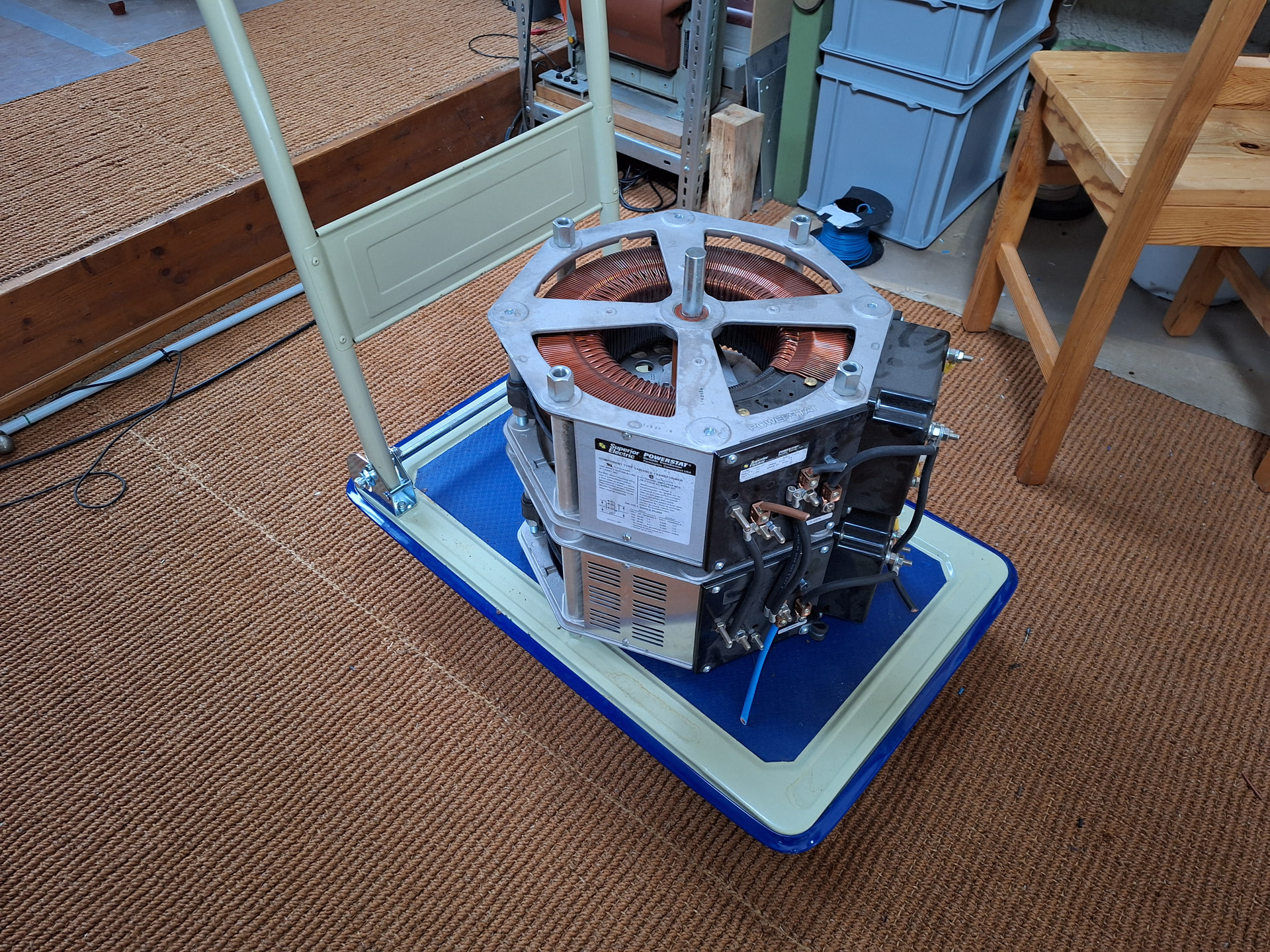 Hallo Leute, wie ihr vielleicht im “Was habt ihr Neues”-Thread bereits gesehen habt, konnte ich durch Glück einen riesigen Zweier-Variac-Stack günstig kaufen. Dieser stammt vom Technorama in Winterthur und hat die sagenhafte Dauerleistung von 15.7kVA. Im einphasigen Betrieb sind es 56A, im zweiphasigen Modus an 400V noch 28A, wobei die Ausgangsspannung etwas höher geht, glaub bis etwas über 500V. Getestet habe ich ihn noch nicht, da er noch etwas feucht ist (es hat geschneit, als wir den Trafo zu zweit vom Auto ins Haus hievten (Gewicht beträgt ca. 50 bis 60kg).